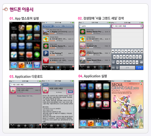 시민과 관광객이 함께하는 다양한 거리 이벤트로 축제 분위기 조성 이번 ‘2010 서울그랜드세일’은 쇼핑과 문화, 관광이 결합된 새로운 개념의 ‘쇼핑 페스티벌’이라는 점이 특징이다. 난타ㆍ점프(JUMP)ㆍ사춤 등 문화공연을 비롯해 한강수상택시, 한국의 집, 국립중앙박물관, 인사동 쌈지길 등 다양한 관광자원을 통해 서울의 문화를 즐기는 것이 가능하다. 한편, 올해는 기존의 종이쿠폰 사용은 물론 모바일 쿠폰, QR코드 등을 통한 쇼핑도 가능하다. 공항이나 관광안내소, 대형 참여업소 등에서 발급받을 수 있는 멤버십카드를 쇼핑 시 제시하면 다양한 할인 혜택을 받을 수 있다. 이와 함께 서울그랜드세일 홈페이지(www.seoulgrandsale.com)에서는 4개 국어(한·영·일·중)로 최신 정보를 확인할 수 있으며, 쿠폰 출력은 물론 다양한 쇼핑 팁도 얻을 수 있다. 시 관계자는 “그랜드세일의 성공적인 개최를 통해 홍콩, 도쿄, 싱가포르 등 다른 경쟁도시들과 차별화되는 서울만의 매력을 널리 알리는 기회로 삼겠다”고 설명했다.