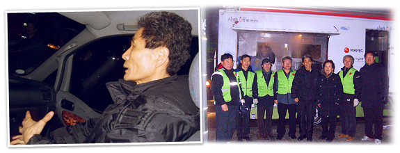 언젠가 처음 남구로역 5번 출구에 서있는 빨간밥차와 낡은 '사랑의 나눔' 봉고차 한 대를 보았습니다. 역 주변을 환하게 밝히고 있는 인력시장 간판들, 수백 명의 일용근로자들 그리고 줄서서 김이 모락모락 나는 국밥 한 그릇을 받아드는 그들……. 새벽녘의 그 신선한 충격은 말로 표현할 수 없었습니다. 요즘 복지 관련 예산 삭감이나 사회 전반적인 무관심으로 어려운 이웃들이 많은데, 이곳은 여전히 훈훈합니다. 이런 봉사활동을 하시게 된 계기가 있으실 것 같은데요.
