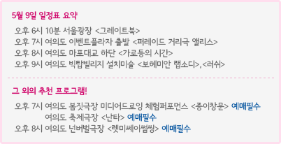 "어때, 이정도면 싱글녀들의 즐거운 놀이로 훌륭하지?" 말없이 모두가 미소와 끄덕임 화답한다. 살다보면, 정해진 가치관에 의해 왜 혼자냐는 질문을 받고, 때론 스스로가 진정한 내 편이 있었으면 하고 바라게 되는 이 땅의 싱글들. 원하는 자들에겐 언젠가 좋은 인연을 만날 것이라고 축복해주고 싶고, 혼자이길 선택한 자들에겐 그들의 선택이 인정받길 응원해주고 싶다. 그리고 하나 더, 하이서울페스티벌은 그저 좋은 다양한 프로그램만을 준비해놓지 않았다는 것. 10일. 바로 그 날, 싱글 남녀 각각 40명이 모여 서로의 이야기를 터놓을 수 있는 만남의 장도 마련했다는 사실! 어제까지 서울시 공식 블로그와 SNS로 지원한 신청자만 400명이 넘는다고 하니, 아마 보이지 않는 별들보다 더 많은 싱글이 서울에 사는 것 같다. 싱글의 꿈과 사랑에 건배를 외치며, 곧 다가올 하이서울페스티벌, 싱글도 커플도 가족도 어린이도 어르신도 모두가 즐겁게 즐기시길!