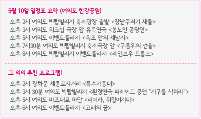 금쪽같은 연휴인 10일은 오래전부터 만나기로 약속한 또 다른 싱글녀들과 12시 30분쯤 점심을 먹고 여의도로 떠나기로 했다. 이번에 만나기로 한 싱글녀들은 대학시절 같은 학원을 다녔다는 이유로 친구가 된 이들. 워낙 일하는 분야에 남자들이 없어서 여전히 싱글이고, 만나서도 남자들보다 자신의 이야기, 세상 돌아가는 이야기를 즐기는 그녀들. 하지만, 가족들의 눈치는 어쩔 수 없이 보고 있는 자녀들이기도 하다. 어쨌든 우리는 할 수 없는 일들에 스트레스 받지 않고, 할 수 있는 일들을 하기로 선택하고 축제를 즐기기로 했다. 어디론가 놀러가고 싶은데 서울 시내에서 열리는 멋진 축제는 놓쳐서는 안 되는 특권이니까. 여의도 도착 예정시간은 2시. 왜냐하면 영국에서 온 <장난꾸러기 새들>을 만나러 가야하니까! 난 이 친구들이 너무 궁금했다. '단순히 분홍, 노랑, 초록의 단색 옷을 입고 관객들에게 장난만 친다면 무슨 의미가 있겠는가? 분명 뭔가가 더 있을 것인데 도대체 그 뭔가가 뭘까?'라는 궁금증이 계속 맴돌았다. 하이서울페스티벌 홈페이지에서 다른 나라에서 공연한 동영상을 유투브로 볼 수 있었지만, 일부러 클릭하지 않았다. 미리 알면 재미없으니까.