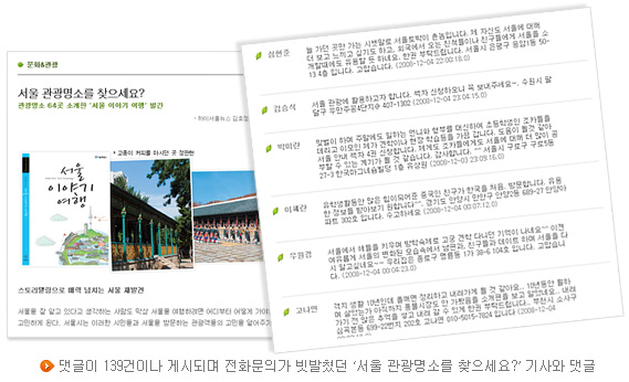 ② 댓글이 많이 게재되어 화제가 되었던 기사도 있다. 139건의 댓글이 기사보다 더 길게 달리고 조회수가 7,382건을 기록하면서 문의 전화가 빗발쳤다. 서울의 관광명소에 얽힌 이야기를 담은 책자 ‘서울 이야기 여행’을 소개한 기사(2009.3)로, 그 책자를 받으려는 독자들의 전화 문의가 폭주하자 해당부서에서 기사를 잠시 내려줄 것을 요청할 정도였다.