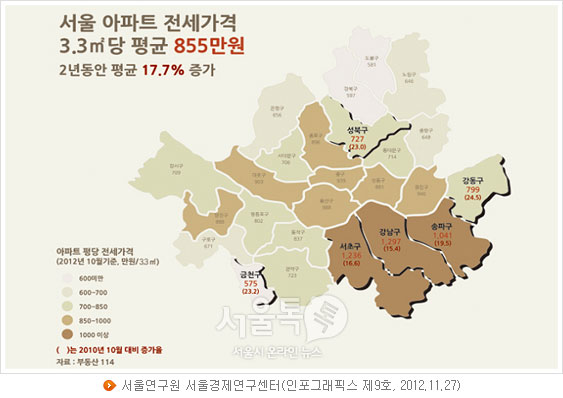 서울 아파트의 평당(3.3㎡ 기준) 전세가격은 855만 원으로 2년 동안 17.7% 증가했다는 서울연구원 서울경제연구센터의 발표가 있었습니다. 이 자료에 따르면 서울 아파트 평당 전세가격이 가장 많이 오른 지역은 강동구로 24.5%나 상승하였고 이어 금천구, 성북구 순으로 각각 23.2%, 23.0%를 기록했습니다.