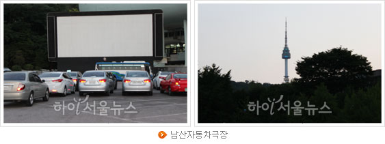 환상 조명을 자랑하는 한강 다리를 보며 차 한잔 하는 여유를 만끽한 후에 가 볼만한 곳은 자동차극장이다. 땅값 비싼 서울에 자동차 극장이 있을까 의문을 가지는 사람들이 많을 것이다. 자동차극장은 당연히 한적한 경기도로 나가야만 할 것 같지만 서울에서도 자동차 안에서 영화를 즐길 수 있는 곳이 있다. 저녁 시간대에 다른 사람의 시선을 신경 쓰지 않고 편안하게 데이트를 즐기고 싶은 연인들, 어린 아이들이 있어서 극장 나들이하기 힘든 가족들에게 인기가 좋다고 한다. 서울시내에는 남산자동차 극장과 잠실자동차 극장이 영업 중이다. 남산자동차 극장은 중구 장충동에 있으며 길 건너편으로 국립극장 해오름이 보이고, 남산타워도 볼 수 있다. 낮에는 외국인 관광객들을 위한 버스 주차장과 택배 회사의 물류창고로 쓰이는 넓은 주차장을 저녁 시간대에 자동차극장으로 활용하고 있는 듯했다.