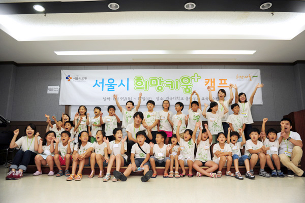 - ▲ 서울 희망키움 캠프에 참가한 아이들이 파이팅을 외치며 기념사진을 찍고 있다.