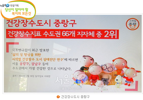 중랑구는 국토연구원의 연구논문 발표에 의하면, 수도권 66개 지자체 중 건강장수지표가 2위를 차지할 정도로 건강장수 도시로서의 면모를 갖추고 있다. 이렇게 상위를 차지할 수 있었던 것은 여러 이유가 있겠지만 이러한 사회 및 의료 복지 서비스의 힘이 크게 작용했으리라 본다. 앞으로도 중랑구의 특화된 복지 서비스를 기대해본다.