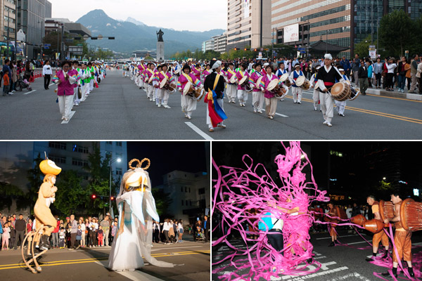 풍물패의 신명나는 연주가 축제의 흥을 돋우고 이어 예술무대 산(한국)의 '선녀의 날개옷을 찾아서', 스너프퍼펫(호주)과 종로구 주민이 함께한 '사람과 인형프로젝트', 온갖 리본과 색종이로 거리를 난장판으로 만드는 베르니세르(프랑스)의 '명랑도시난장'이 태평로 곳곳을 축제의 빛으로 물들였다.