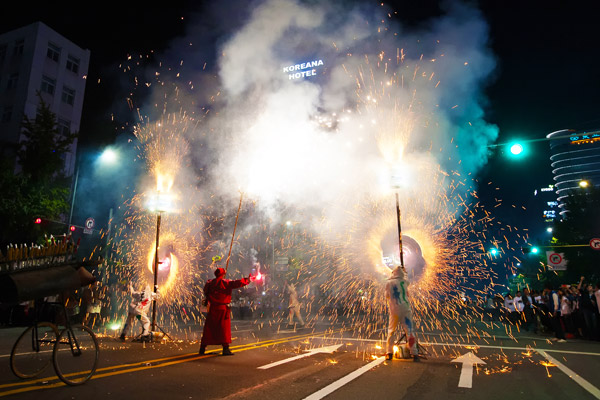 화려한 불꽃쇼로 시작된 매직 퍼레이드는 스페인 발렌시아 축제의 오랜 전통에서 기원한 공연으로 하얀색 악마와 성난 황소, 불 뿜는 나무 등의 캐릭터들이 분수처럼 뿜어져 나오는 폭죽을 들고 신나는 공연을 선보였다.