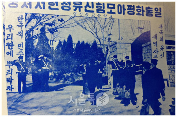 학교(종로구 경신중·고등학교)에 등교하는 학생들, '뭉쳐서 헌정유신 힘모아 평화통일' 슬로건과 군대 입대하듯 등교하는 학생들을 볼 수 있다.