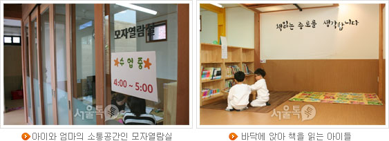 번잡한 외부와 달리 도서관 내부는 평온함 그 자체였다. 신발을 벗고 들어와야 하는 도서관은 마을사랑방 모습에 가까웠다. 기존 도서관 보단 적은 규모(31평)지만, 시원하게 트인 마루와 마당 덕분에 답답하지 않다. 도서관에 책상이라고는 '모자열람실'에 있는 원목밥상이 전부다. 책보단 사람에 집중한 도서관임을 말해준다. 이 때문에 이용자들 대다수는 아이와 어머니들이다. 바닥에 앉아서 아이에게 책을 읽어주는 어머니, 공간을 돌아다니거나 누워서 책 읽는 아이들 모습은 이 도서관에선 자연스러운 풍경이다. 정숙에 익숙한 도서관에선 보기 힘든 편안하고 자유로운 분위기다.