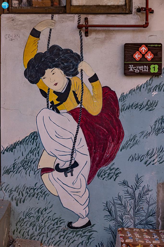 꽃담벽화마을의 이름처럼 마을 담벼락에는 꽃의 그림이 많이 그려져 있다. ⓒ유서경