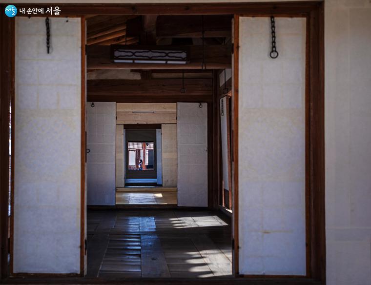 연경당 안채와 사랑채는 서로 연결되어 두 개인 듯 하나의 건물이다. 많은 문을 열어 놓아 사랑채를 지나 선향재 앞을 지나는 관람객이 마침 앵글에 들어왔다 ⓒ양인억