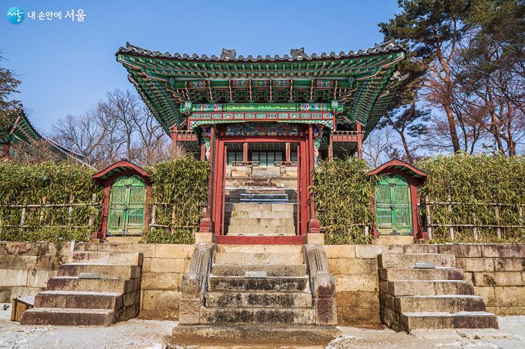 연경당 동쪽 돌계단 위에 자리 잡은 농수정. 연경당이 단청을 하지 않은 것처럼 농수정도 단청이 없다. 농수(農繡)는 '짙은 빛을 수놓는다’는 뜻이다 ⓒ양인억