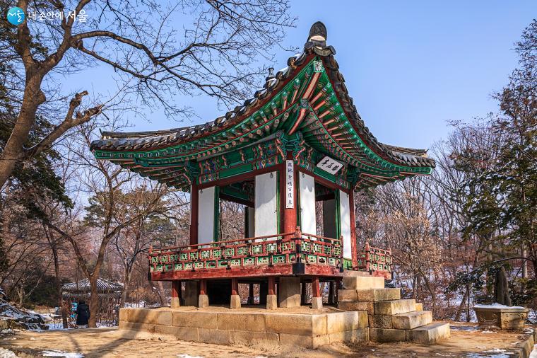 세조 때 팠다는 네 개의 샘을 기념하기 위해 숙종16년(1690)에 세운 비석(사정기)을 보호하는 비각(사정기비각)이 부용지 서편에 자리하고 있다 ⓒ양인억