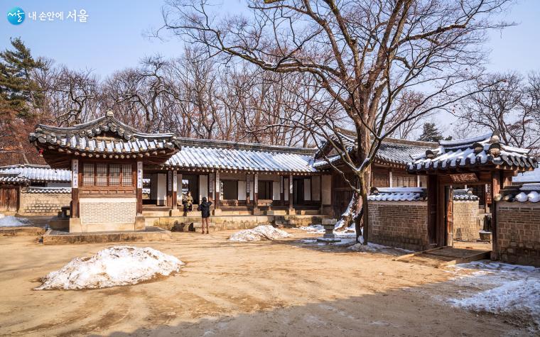 기둥에 많은 주련을 달고 있는 연경당 사랑채. 남향을 하고 있는 지붕의 눈이 많이 녹았다 ⓒ양인억
