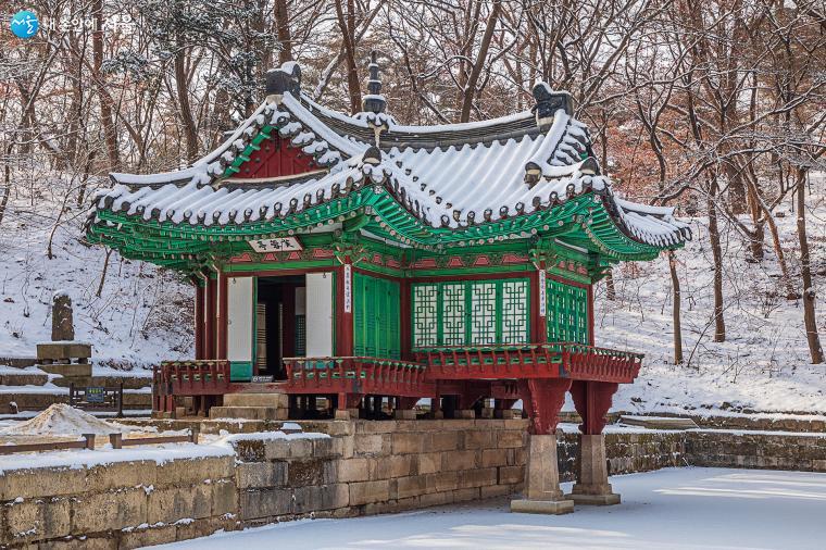 연꽃을 사랑하는 마음을 담아 숙종이 세운 날렵하고 화려한 애련정. 애련정과 함께 한 소나무의 붉은 수피가 흰 눈에 덮인 애련지와 잘 어울린다 ⓒ양인억