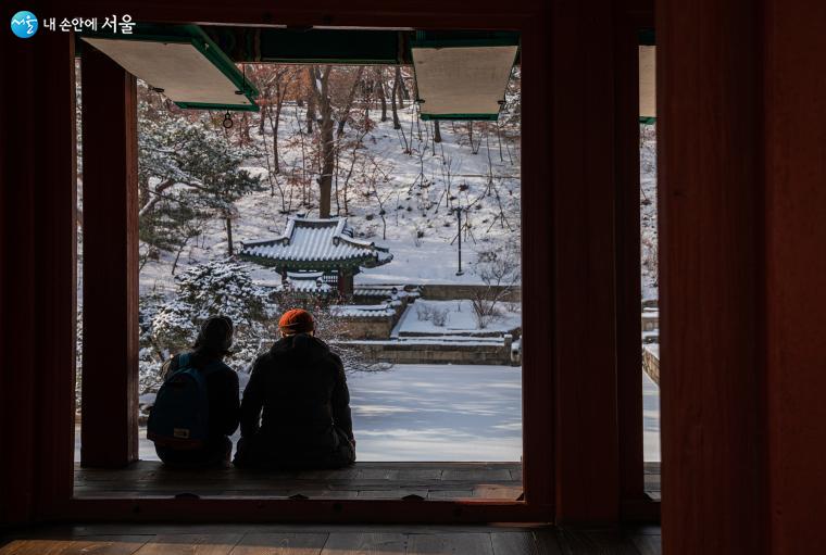 영화당은 관람객에게 휴식을 허락한 공간이다. 한 겨울의 멋진 후원 정경을 바라보며 잠시 휴식을 취하는 관람객 앞으로 부용지와 사정기비각이 보인다 ⓒ양인억