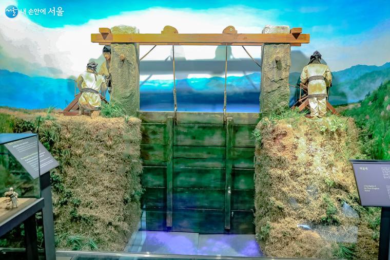 삼국시대 농사에 사용할 물을 원활히 공급하기 위해 만든 '벽골제'를 재현한 모형. ⓒ박우영