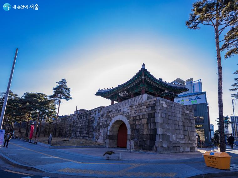동대문(흥인문, 흥인지문) 우측, 흥인지문 사거리에 위치한 흥인지문공원은 복원 및 보존이 잘 된 한양도성 성곽이 병풍처럼 서 있다 ⓒ양인억