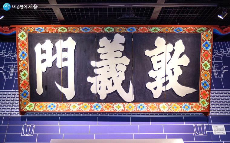 도성의 서쪽 문인 돈의문은 1915년 일제강점기 전차노선 복선화로 철거되고 말았다. 국립고궁박물관 수장고에 보관되어 온 돈의문 현판은 2014년 7월 31일 한양도성박물관 개관으로 새 집을 찾아 관람객을 맞이하고 있다 ⓒ양인억