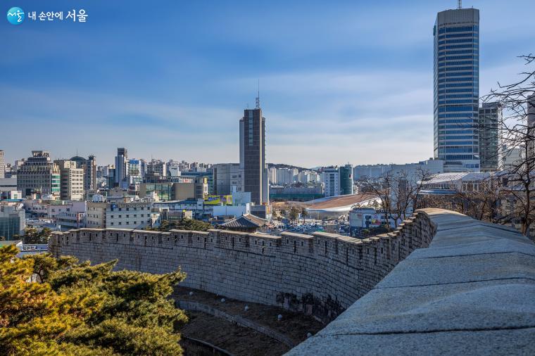 도성 안쪽과 달리 바깥쪽은 성벽의 높이가 상당하다. 지형을 따라 굽이친 도성 위로 흥인지문의 2층 문루 지붕이 살짝 보인다 ⓒ양인억