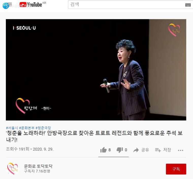 요즘 모든 연령대에서 핫한 트로트 무대도 준비되어 있다. 서울시는 코로나19로 인해 외출이 어려워져 여러 단절을 겪고 있는 시민들을 위해 안방극장에서 볼 수 있는 트로트 무대도 기획했다. 트로트에 큰 관심이 없는 필자도 알고 있는 가수 현미 씨의 무대도 바로 안방에서 만나볼 수 있다.