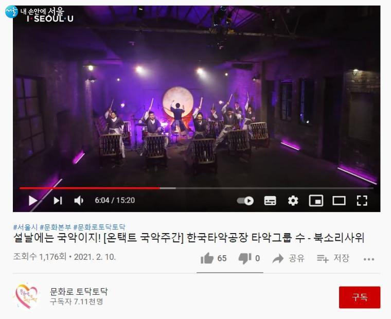 서울시는 코로나로 지친 서울시민들에게는 응원과 희망의 메시지를 전하고, 코로나가 장기화되어 활동 무대가 사라진 문화예술가들에게 공연을 펼칠 수 있는 장을 제공하는 '문화로 토닥토닥' 프로젝트를 진행하고 있다. 설 연휴를 맞이해 [설날에는 국악이지!] 시리즈가 업로드되었다. 설 연휴가 포함된 10일부터 16일까지 새로운 국악영상을 유튜브 채널에서 볼 수 있었다. 그 외에도 음악극, 발라드, 댄스, 트로트 등 다양한 연령대를 고려한 음악공연 콘텐츠가 있다. 문화로 토닥토닥 유튜브 채널에서 언제든지 볼 수 있다. 유튜브 검색창에 '문화로 토닥토닥'을 검색하면 채널을 발견할 수 있다. ☞문화로 토닥토닥 유튜브 바로가기