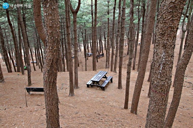 곳곳에 쉼터가 마련되어 시민들이 휴식을 취하기도 했다. 잣나무 숲에는 워낙 띄엄띄엄 테이블과 의자가 배치되어 있어서 코로나19 감염 방지를 위한 거리두기가 저절로 유지되고 있었다.