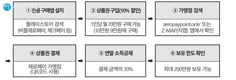 상품권은 전용 구매앱을 통해 구입이 가능하다. 플레이스토어에서 제로페이 관련 앱인 머니트리, 비플제로페이, 체크페이 등을 검색해 설치 후 회원가입과 계좌를 연결하면 1만원, 5만원, 10만원권 단위로 구입할 수 있어 편리하다.