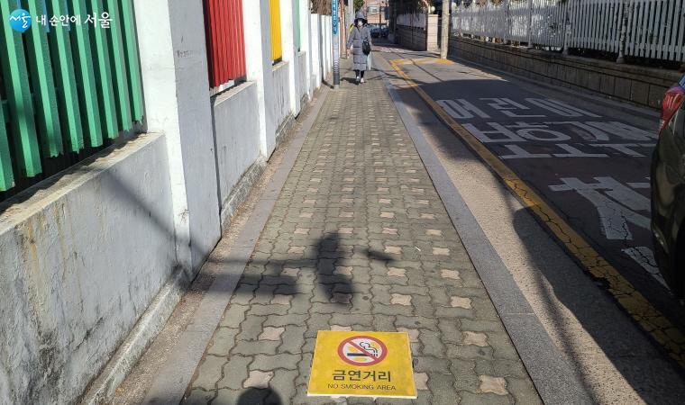 금연거리로 지정된 곳에는 바닥에 ‘금연거리 바닥 안내표지판’이 설치되어 있다. 이 표지판은 멀리서도 눈에 잘 띄는 노란색 바탕에 남·여 학생을 상징하는 픽토그램을 사용해 금연구역에 대한 시민 인지도를 높였다. 또 금연 거리가 주요 통학로이자 유동인구가 많은 점을 고려해 눈이나 비에 따른 미끄럼 방지 등 안정성과 내구성을 반영한 세라믹 재질로 제작됐다. 거리의 시작과 끝에 가로형 표지판을 설치하고 50m 간격마다 정사각형의 중간 표지판을 설치했다.