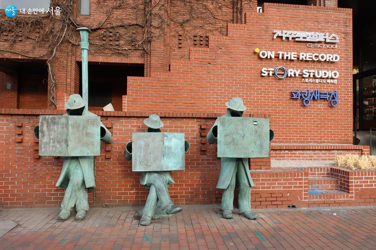 혜화역 2번 출구로 나오면 바로 파랑새 극장 앞에 세워진 조형물이 보인다 ⓒ정향선