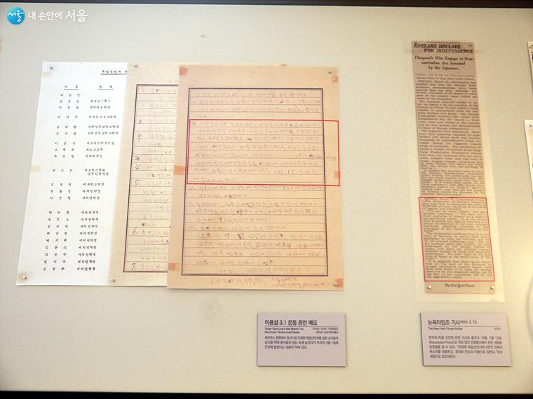 세브란스 병원에서 등사기로 인쇄한 독립선언서를 일본 순사들의 감시를 피해 환자들의 침상 속에 숨겼다가 무사히 3월 1일에 전국에 돌렸다는 내용이 적힌 이용설 3.1운동 증언 메모와 출처가 AP통신으로 나와있는 한국의 독립 선언에 관한 뉴욕타임스 기사 ⓒ최윤영