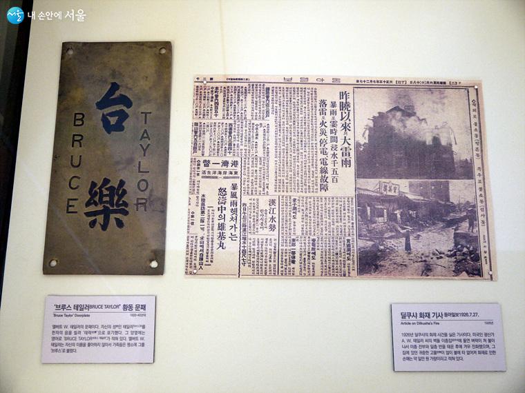 자신의 성 테일러를 한자의 음을 빌려 태락으로 표기한 문패와 1926년 딜쿠샤 화재 사건을 실은 동아일보 기사 ⓒ최윤영