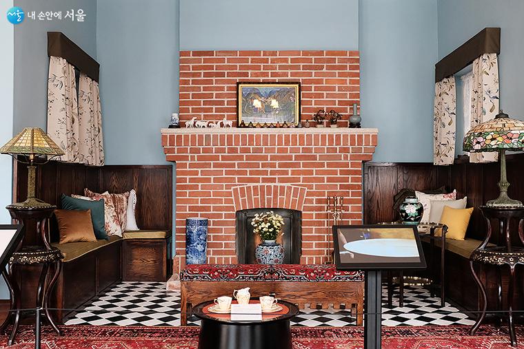 테일러 부부가 여가 시간 대부분을 보낸 2층 거실. 1층과 마찬가지로 가운데 벽난로가 있고, 양옆에는 잉글누크가 설치되었다. 벽난로 위에는 당시의 사진처럼 앨버트 W.테일러가 수집한 고려청자와 말 모형들이 놓여 있다. ⓒ김아름