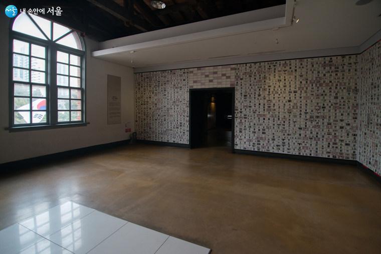 전시관(보안과청사) 2층에 수형기록표로 벽면을 가득 채워 서대문형무소에서 옥고를 치르고 순국하신 독립운동가를 기억하고 추모하는 공간이다. 창밖에 태극기가 바람에 펼쳐진다. 서대문형무소역사관 앱을 핸드폰에 설치하면 설명을 이어폰으로 들을 수 있다 Ⓒ김인수