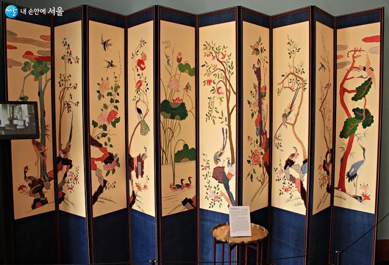자수 화조도 병풍, 테일러 부부는 조선의 궁전에서 쓰던 방식대로 병풍들을 폈다 접었다 하면서 벽을 만들거나 방의 크기를 조절하였다. ⓒ한춘석