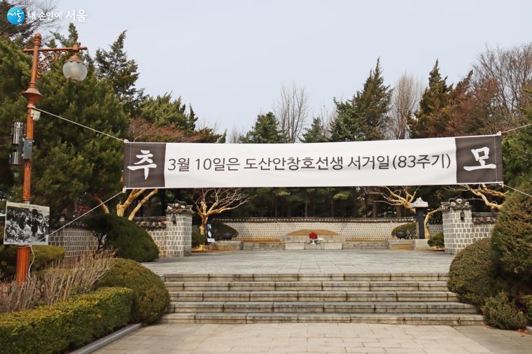 3월 10일 도산안창호선생 서거일 83주기 현수막이 묘소 앞에 걸려있다 ⓒ정향선