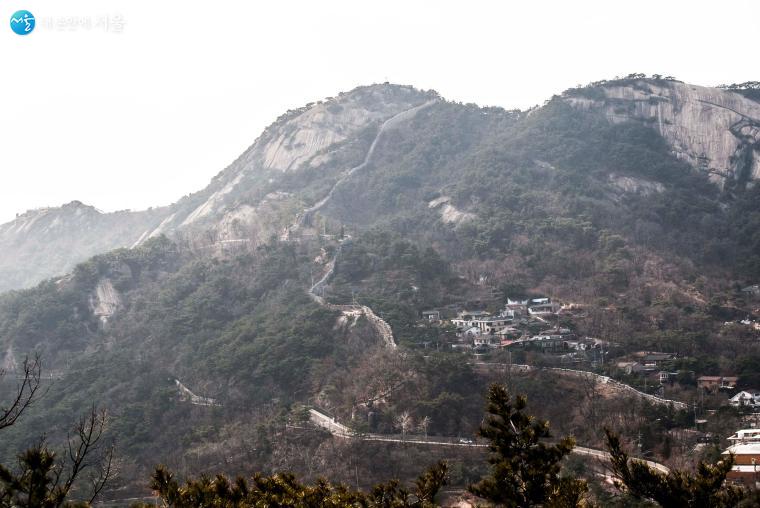 백악에서 바라본 인왕산의 모습. 성곽이 굽이굽이 들어선 모습이 마치 용과 같다 ⓒ최기곤