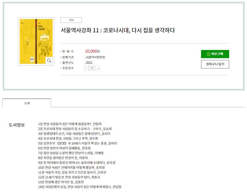 수강생의 제한이 있는 강의여서 더 많은 사람이 듣지 못하는 게 아쉽지만, 강의와 별도로 책을 읽어보는 것만으로도 충분히 흥미로운 역사 공부가 될 것이라는 생각이 든다. ‘코로나 시대, 다시 집을 생각하다’ 교재는 서울책방이나 온라인(https://store.seoul.go.kr/)에서 1만원에 구매할 수 있다. 하반기 역사강좌를 수강하고 싶다면 8월쯤 서울역사편찬원 홈페이지(https://history.seoul.go.kr)에서 새로운 강좌가 올라오면 신청해보는 것도 좋겠다.