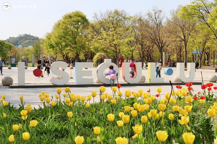 바닥 분수 앞에 세워진 너와 나의 서울 ⓒ정향선