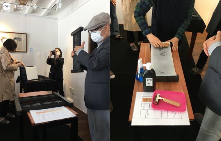 탁본 설명과 시연하는 모습. 한지에 물을 뿌리고, 말리고, 롤러로 먹을 묻히는 과정으로 진행됐다. ⓒ박지영