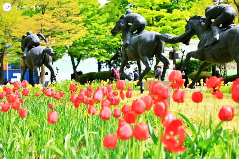튤립 옆길을 질주하는듯한 군마상 ⓒ이재몽