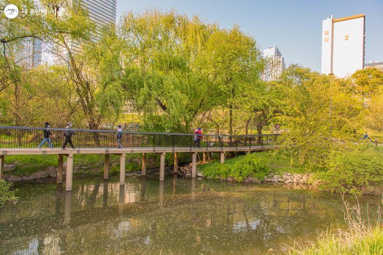 생태연못 (여의못) 데크 산책로를 걷는 시민들 ⓒ이한웅