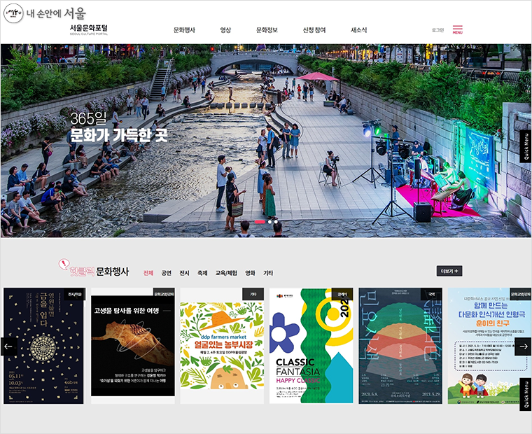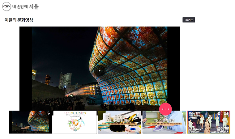 먼저 서울시의 각종 문화행사‧공연을 영상으로 감상할 수 있는 ‘문화영상’ 메뉴를 새롭게 만들었다. 특히 라이브로 중계하는 경우 홈페이지 메인화면 최상단에 스트리밍 채널(유튜브 등)로 연계해 실시간으로 시청할 수 있게 했다.