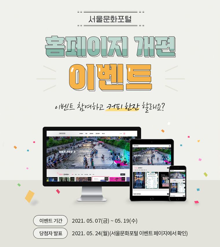 한편, 서울시는 홈페이지 개편을 기념해 이벤트를 19일까지 진행한다. 서울문화포털 홈페이지 내 이벤트 이미지를 캡쳐한 뒤 SNS에 공유하고 지정된 구글 이벤트 페이지에 SNS게시물을 등록하면 된다. 참가자 중 추첨을 통해 50명을 선정, 커피 쿠폰을 제공한다. 당첨자는 5월 24일에 발표할 예정이다.