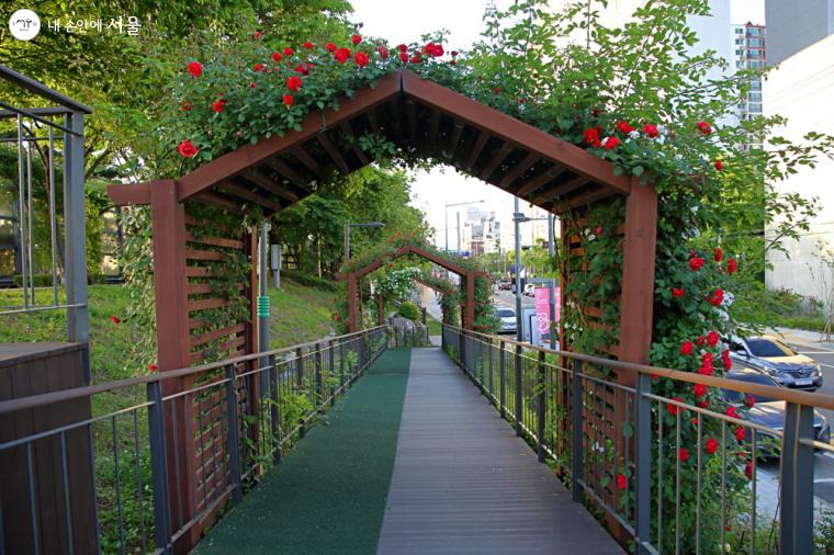 중랑장미공원 입구에서 시작하지 않아도 중간중간 오갈 수 있는 통로가 많다. 당연히 장미터널을 걷다가 내려갈 수도 있다. 반대편 중랑천으로 내려가는 다리도 있다. 현재는 중랑천 쪽에서 만발한 장미를 더 볼 수 있다.