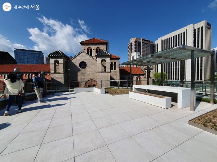 이 전시관을 지나 왼쪽으로 50m쯤 가니 바로 세실극장 건물이 보였다. 반가운 마음에 바로 세실극장 입구로 향했지만, 문이 잠겨있어 순간 당황했다. 옥상 전망대로 향하는 승강기는 극장 입구의 왼편에 따로 마련돼 있었다. 이는 시민 누구나 부담 없이 이용할 수 있도록 영국대사관 앞 도로에서 곧바로 탈 수 있는 승강기를 설치한 것이라고 한다. 전망대용 승강기를 타고 옥상에서 내리니 새로운 풍경이 눈에 들어왔다. 가장 먼저 이국적인 느낌의 건물이 시선을 사로잡았는데, 서울시 유형문화재 제35호로 지정된 성공회 서울주교좌 성당이었다.