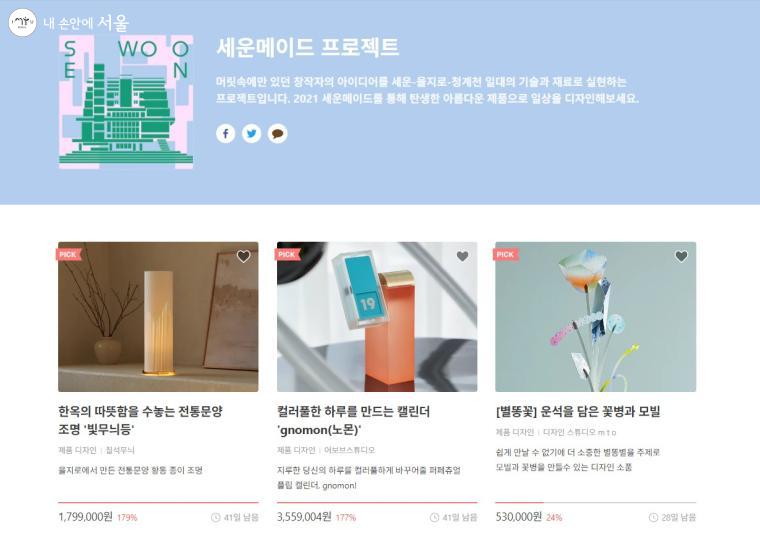 1968년 완공되어 현재는 도시재생으로 주목받는 ‘다시, 세운’ 프로젝트로, 여러 드라마 촬영지로 친숙한 '세운상가'. 세운상가의 실력 있는 장인들과 청년들의 아이디어가 '세운메이드'를 통해서 융합되었다. '세운메이드'는 머리 속에만 있던 창작자의 아이디어를 세운-을지로-청계천 일대의 기술과 재료로 실현해 신제품 개발과 판매를 돕는 프로젝트다. 기술장인과 청년스타트업의 협업으로 신제품을 공동 개발하고 크라우드 펀딩으로 투자를 받아 매년 세운지역 특색을 담은 신제품을 선보이고 있다.