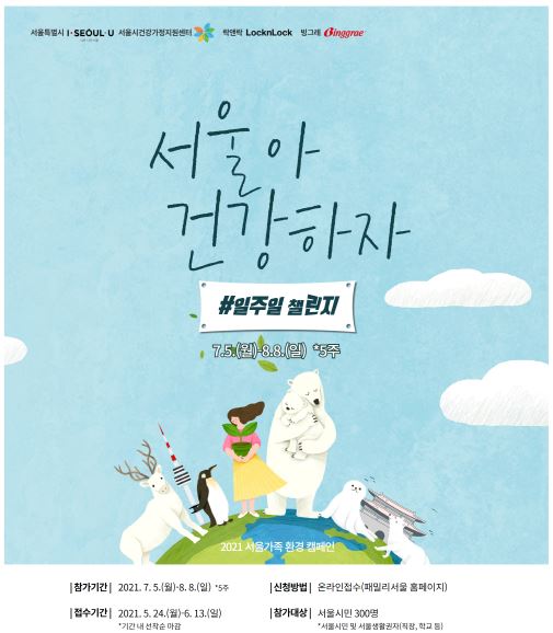 한편 패밀리서울에서는 ‘서울아 건강하자!’ 환경캠페인 챌린지 참가자를 모집하고 있다. 접수기간은 6월 13일까지 300명을 선착순으로 받는다. 7월 5일부터 5주간 매주 지구 환경을 보호하는 한가지 챌린지를 실천하고 인스타그램에 게시하는 것으로, 인증을 완료할 시 전원 선물을 제공한다.