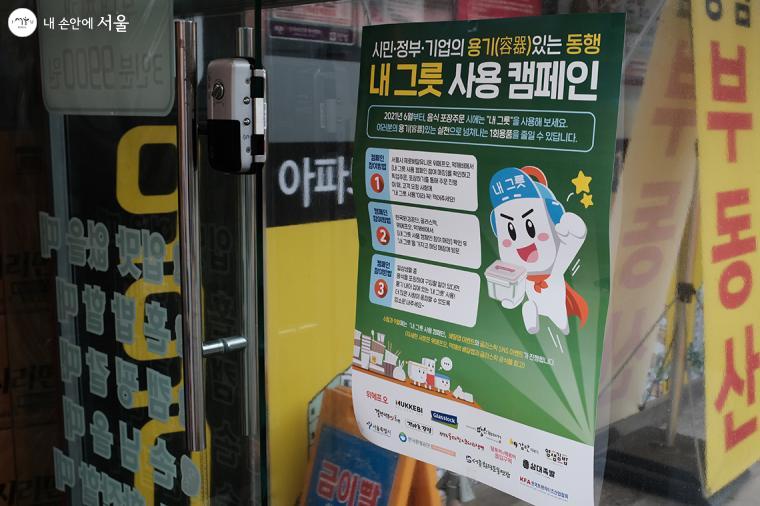 가게 입구에는 시민·정부·기업의 용기(容器)있는 동행 ‘내 그릇 사용 캠페인’ 홍보전단이 부착되어 있다. ⓒ김아름