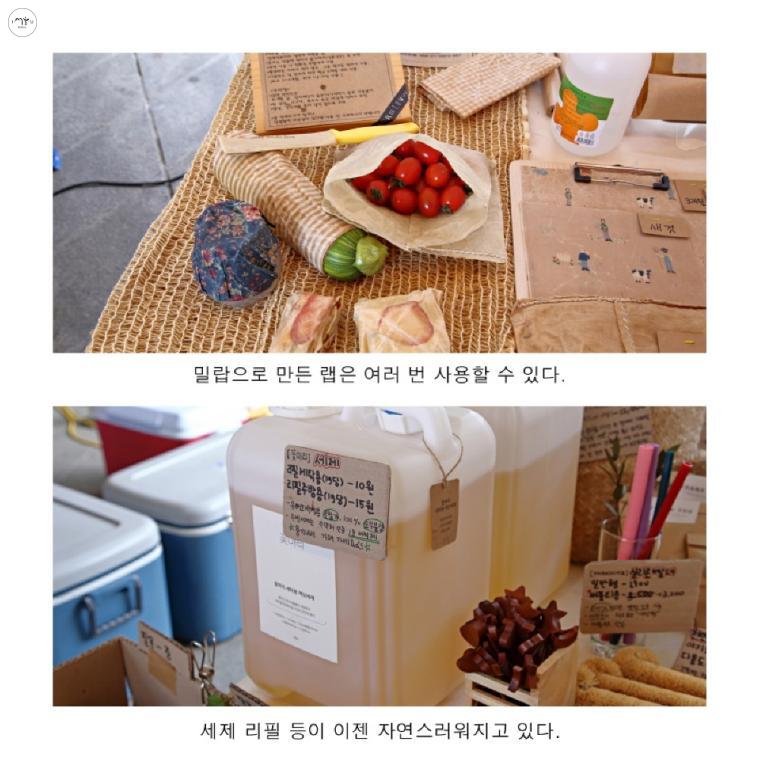 ‘얼굴있는 농부시장’에서도 제로웨이스트는 계속된다. 리필용 세제를 살 수 있는 벌크통 등 환경을 생각하는 제품들이 이제 자연스러워지고 있다. 유기농 면에 프로폴리스 천연 밀랍을 입혀 만든 밀랍랩은 찬물에 씻어 여러 번 사용할 수 있다.